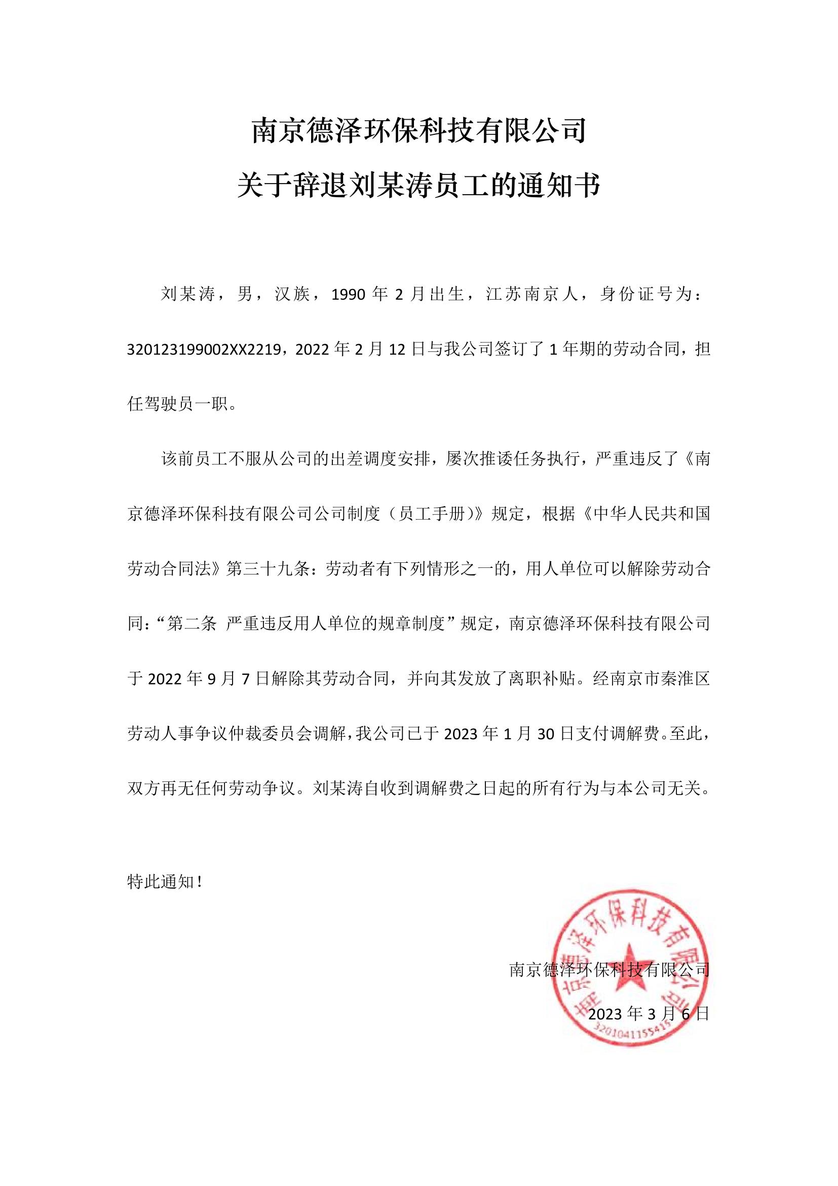 南京德澤環(huán)??萍加邢薰娟P(guān)于辭退劉某濤員工的通知書(shū)
