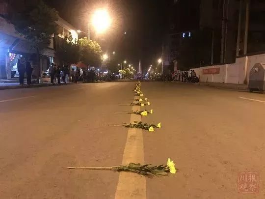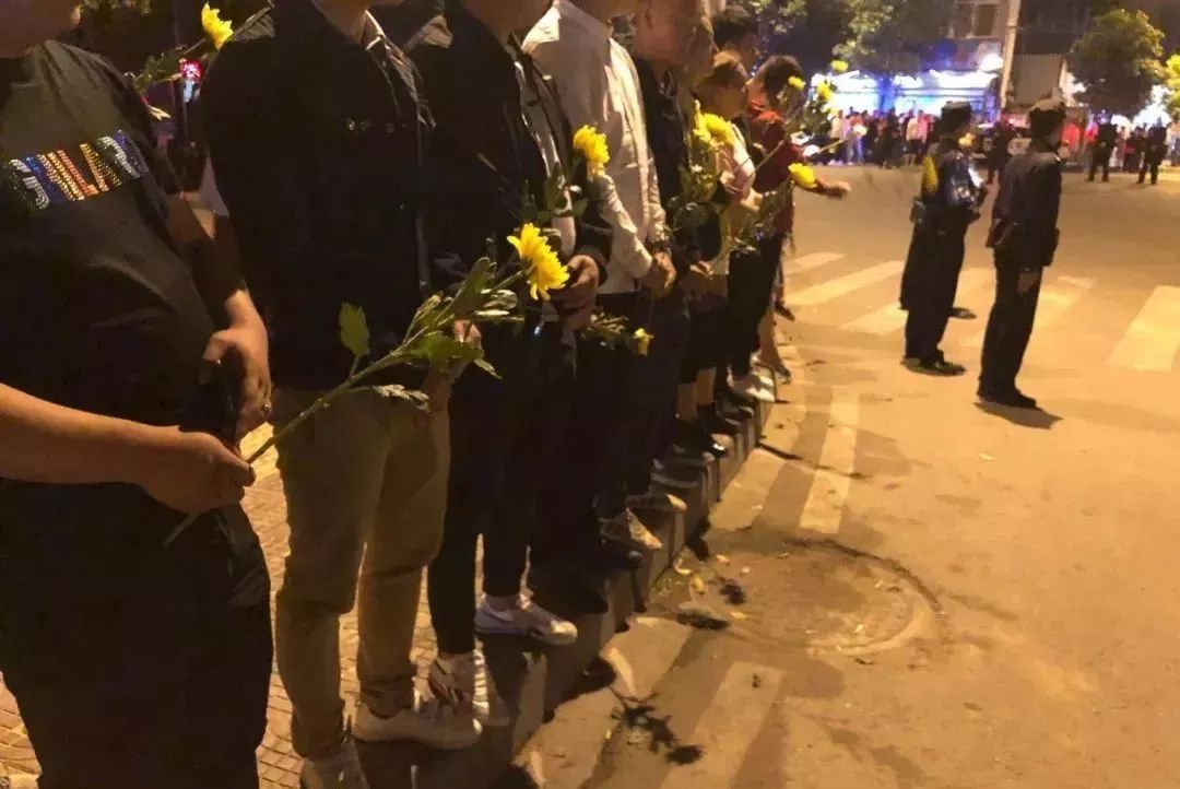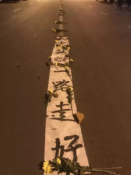 路面上擺放著菊花,寫著挽言:救火英雄一路走好。